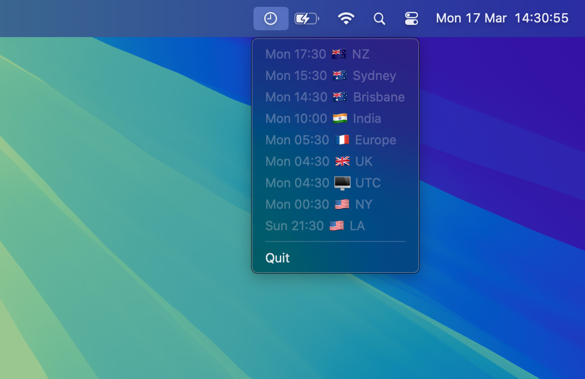 Timezy is a simple macOS menu bar app that displays common timezones, it accounts for daylight savings time in the local region.
